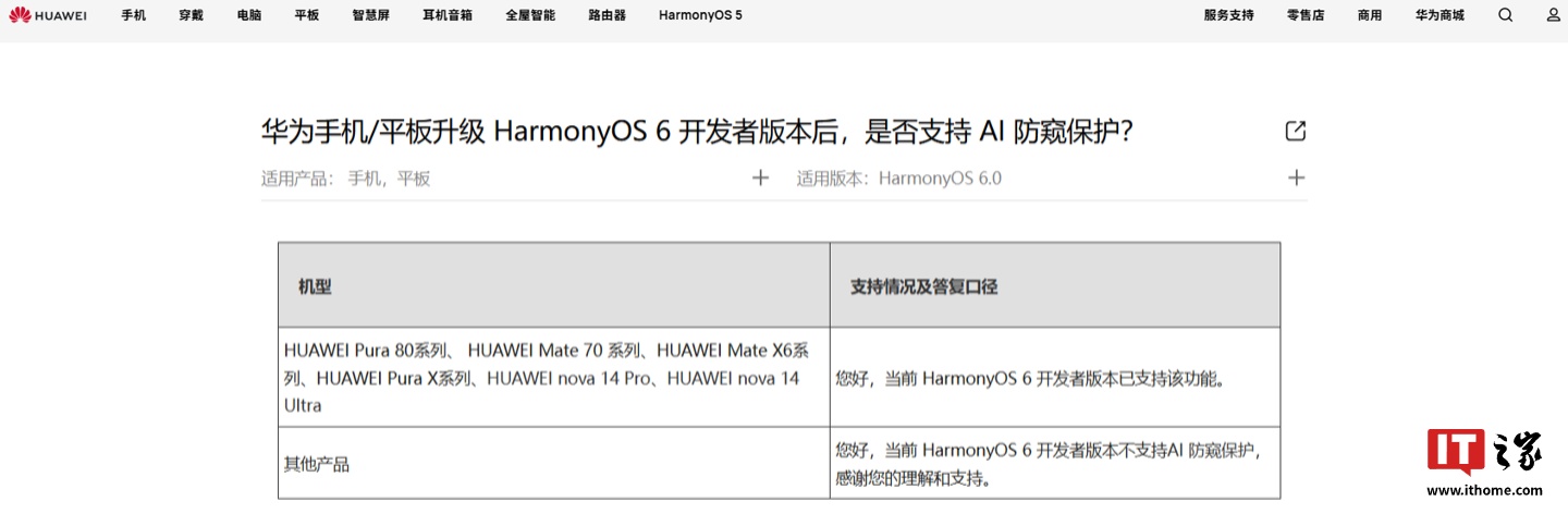 IT之家从华为官网获悉,部分机型在更新鸿蒙 HarmonyOS 6 开发者版本后,支持 AI 防窥保护。具体情况如下: