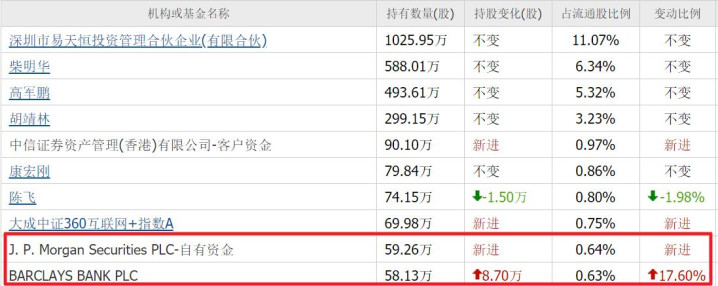 J.P摩根三季度新进98万;巴克莱新进84万,分别位列第七、九大流通股东。