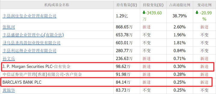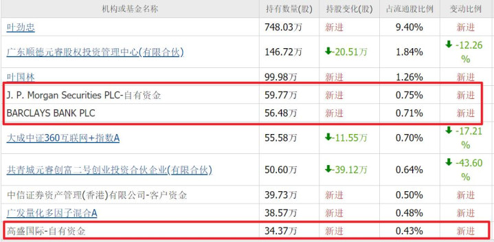 J.P摩根新进59万股;巴克莱新进56万股;高盛新进34万股。
