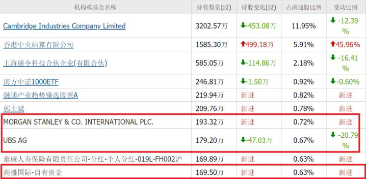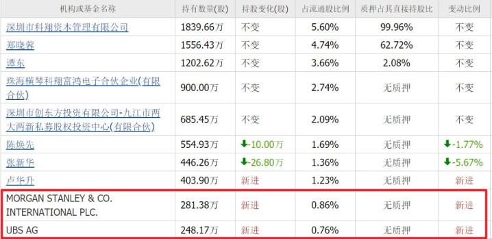 摩根斯坦利、高盛新进前十,瑞银小幅减仓。