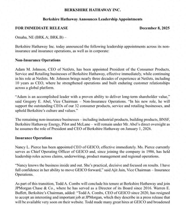 作为此次过渡安排的一部分,托德·康布斯将结束在伯克希尔的任期,加入摩根大通集团——他自2016年起一直担任该公司董事会董事。伯克希尔董事长巴菲特补充道:“自2020年起担任GEICO首席执行官的托德·康布斯已辞职,将接受摩根大通一项有趣而重要的工作,相关细节将在他们即将于官网发布的新闻稿中说明。托德为GEICO招募了许多优秀人才,拓宽了公司视野。摩根大通此次也一如既往地做出了明智决定。”